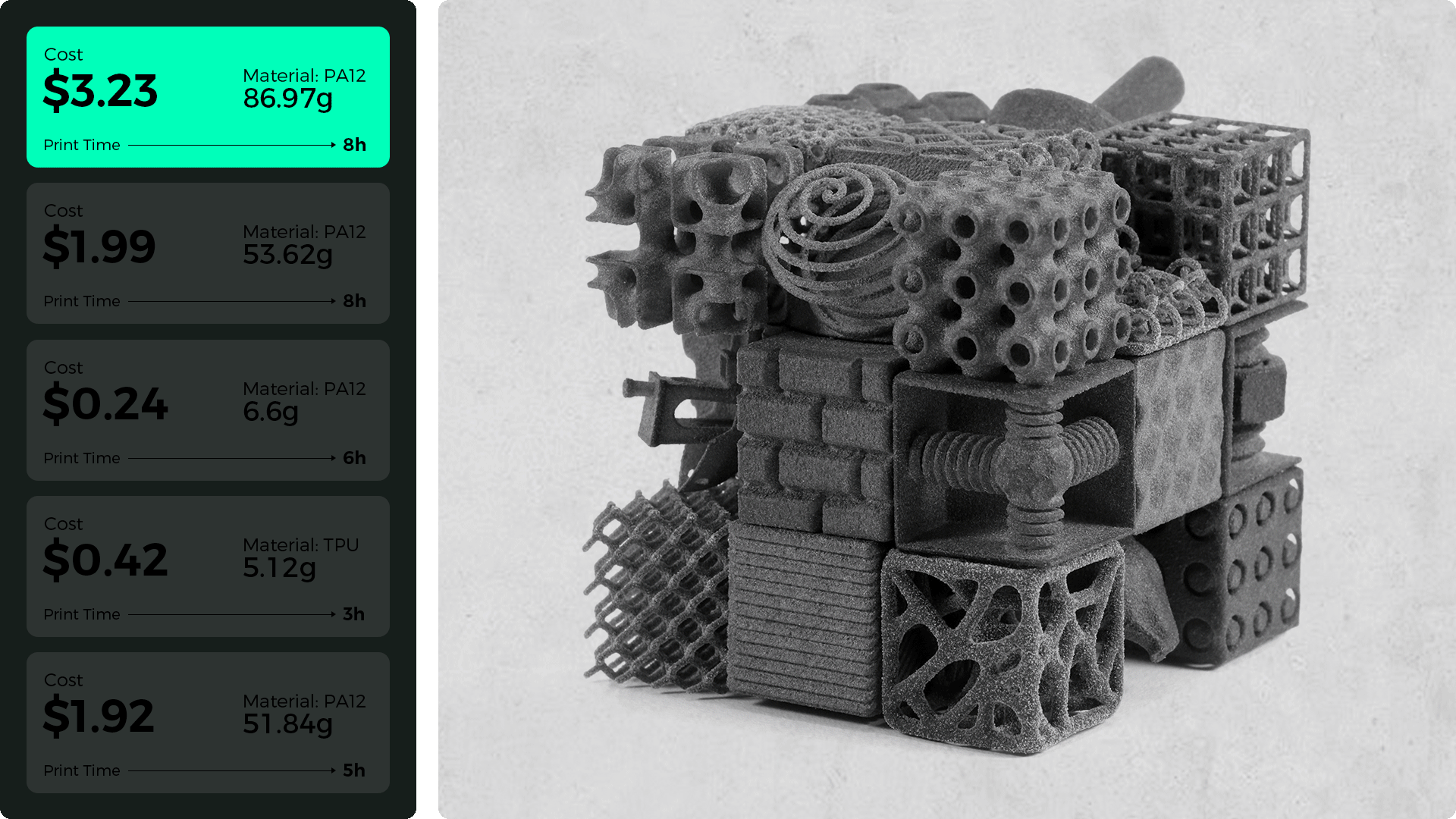 Switch seamlessly between tough nylon 12, flexible TPU, or advanced PA11 composites. Open parameters and reusable powder reduce costs while maximizing flexibility.