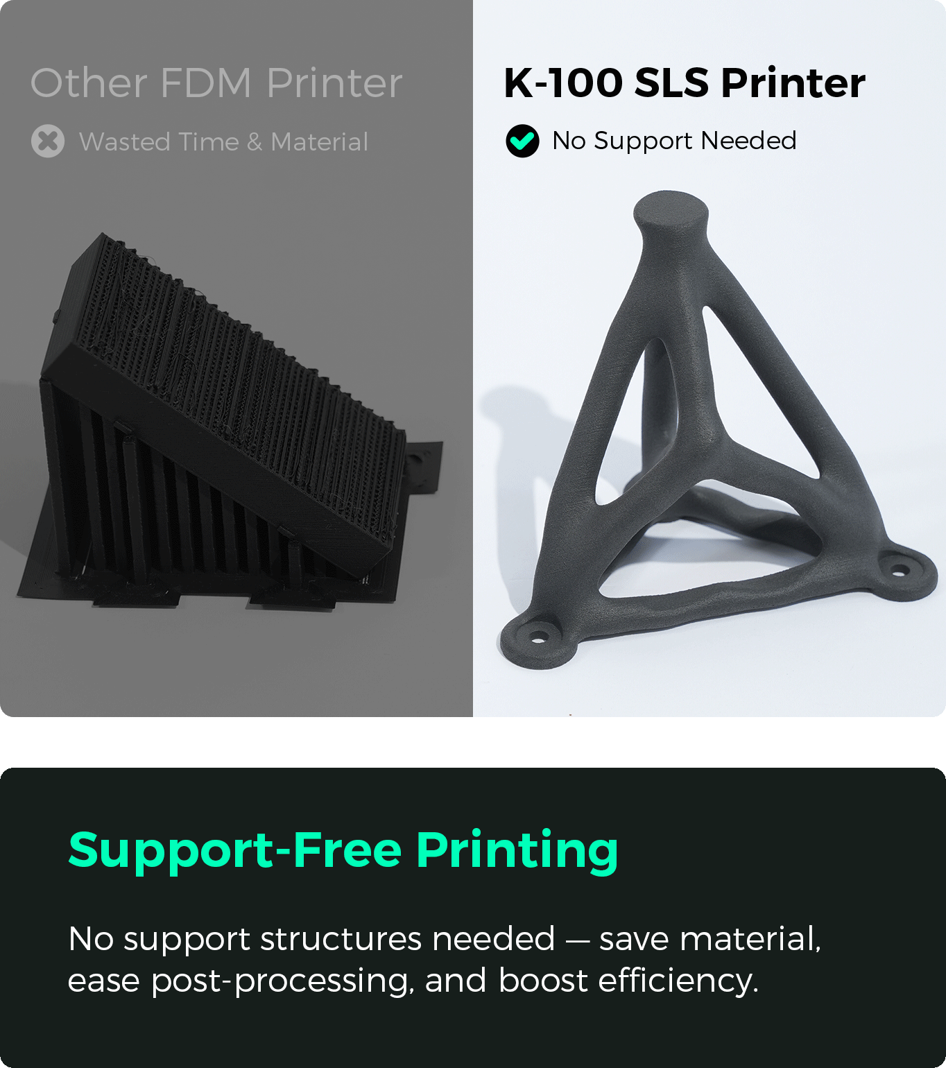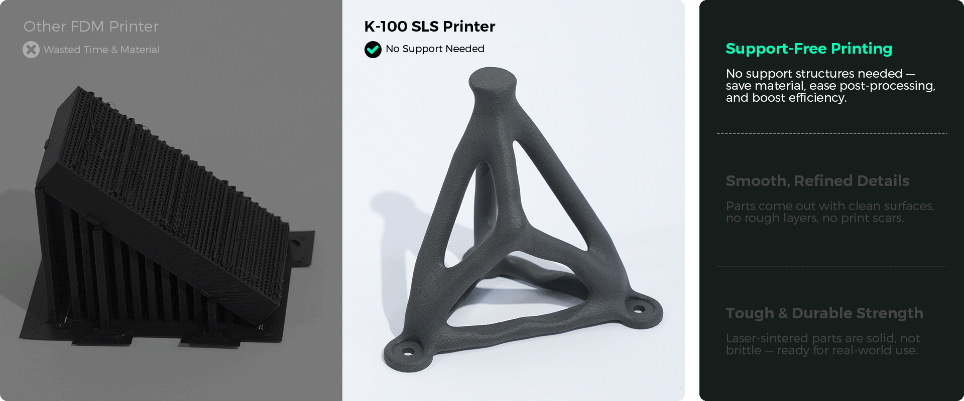 With PA12 and TPUcompatibility, the K-100 achieves 50 MPa + tensile strength and 120 °C + heat resistance, ensuring every part is strong, stable, and production-ready.