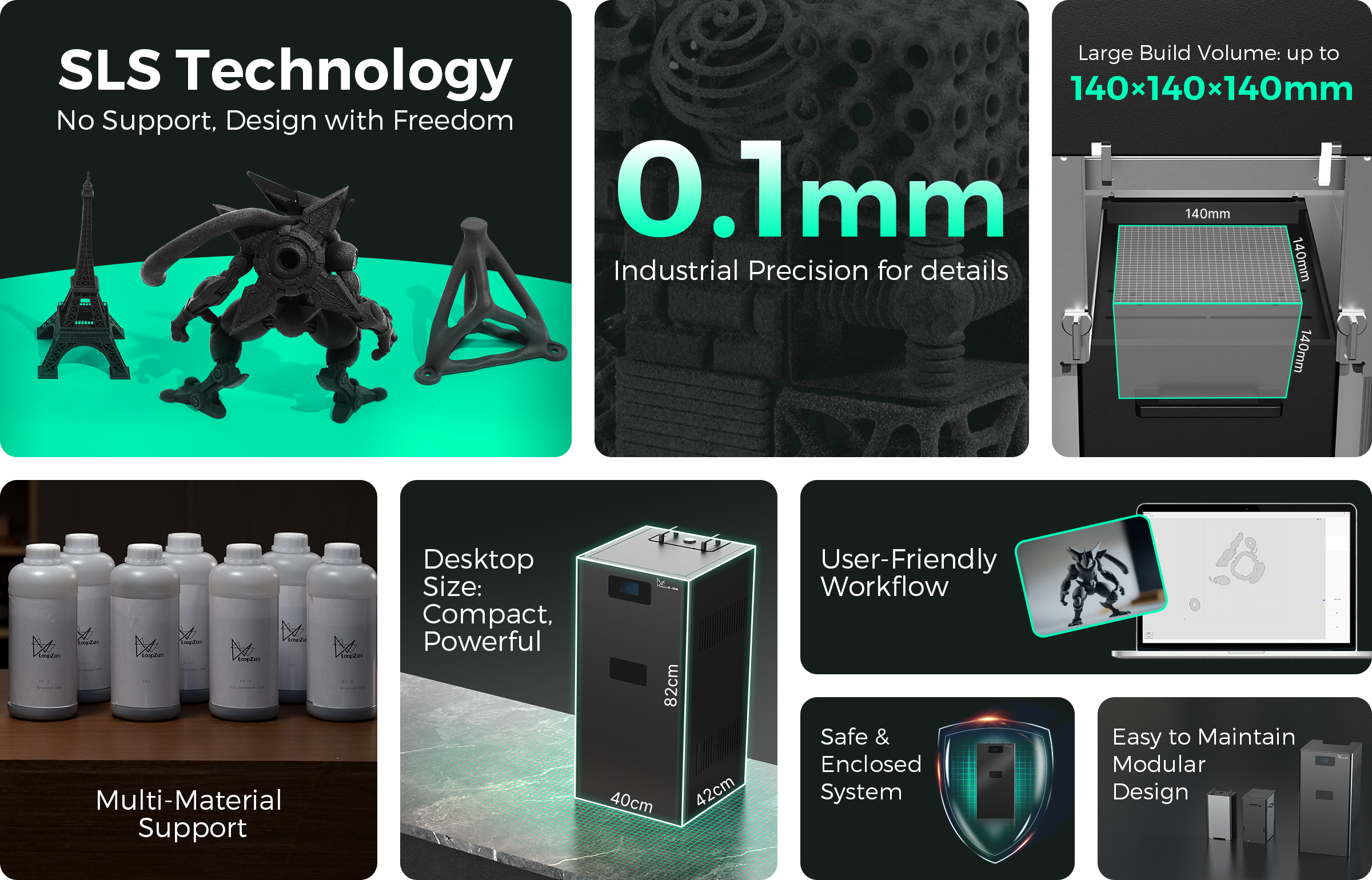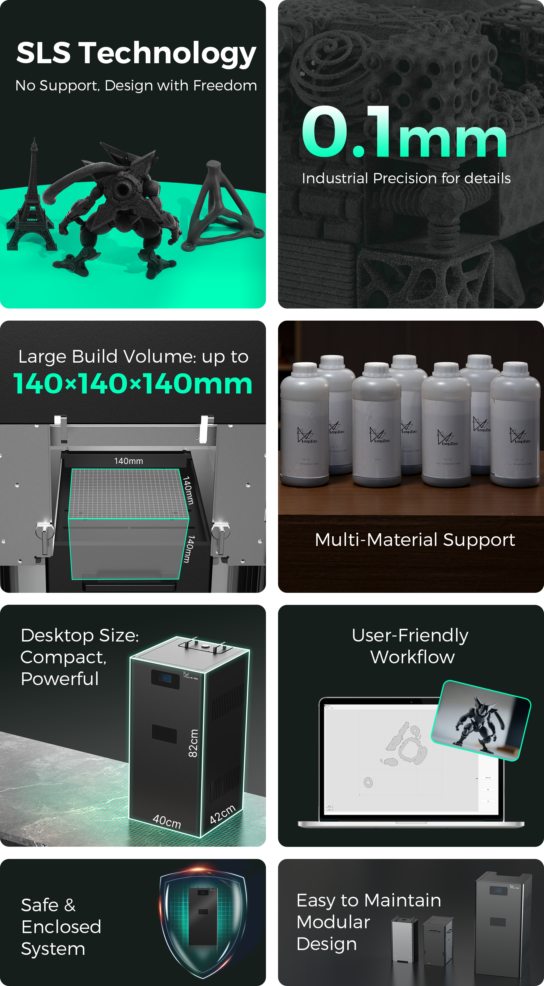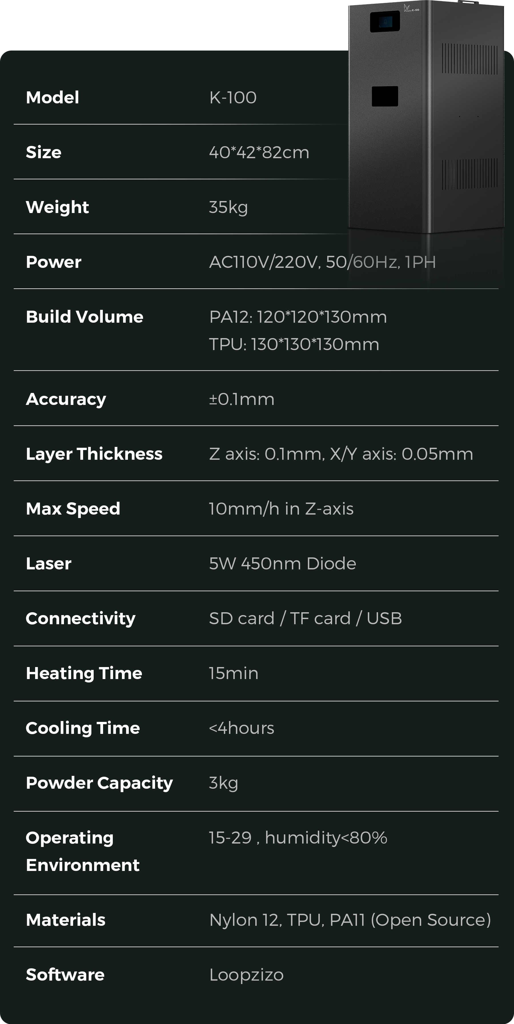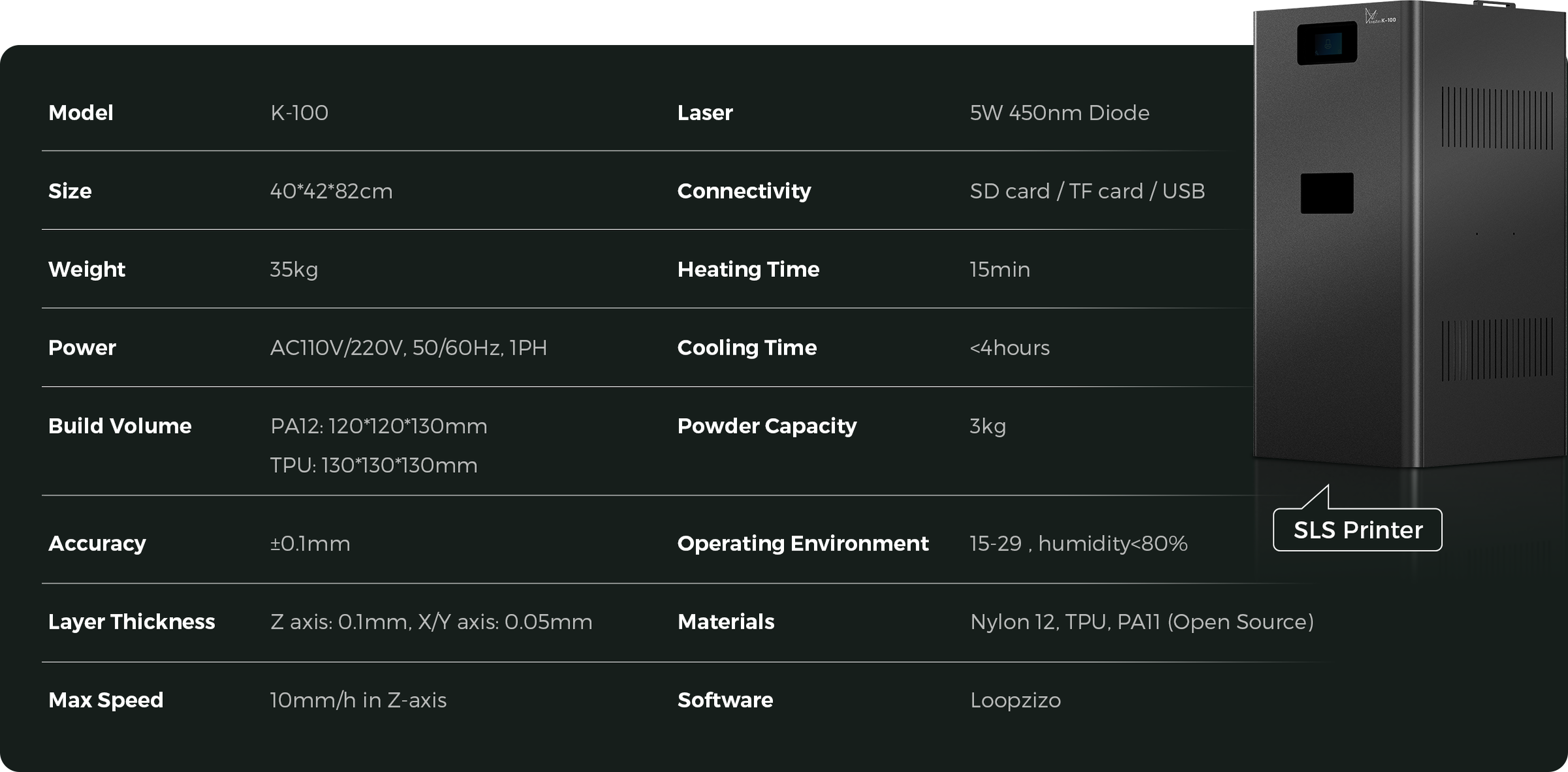 Loopzizo K-100 shrinks industrial SLS technology onto your desktop. Print incredibly strong, complex, and ready-to-use parts in hours, not days—with no supports needed.